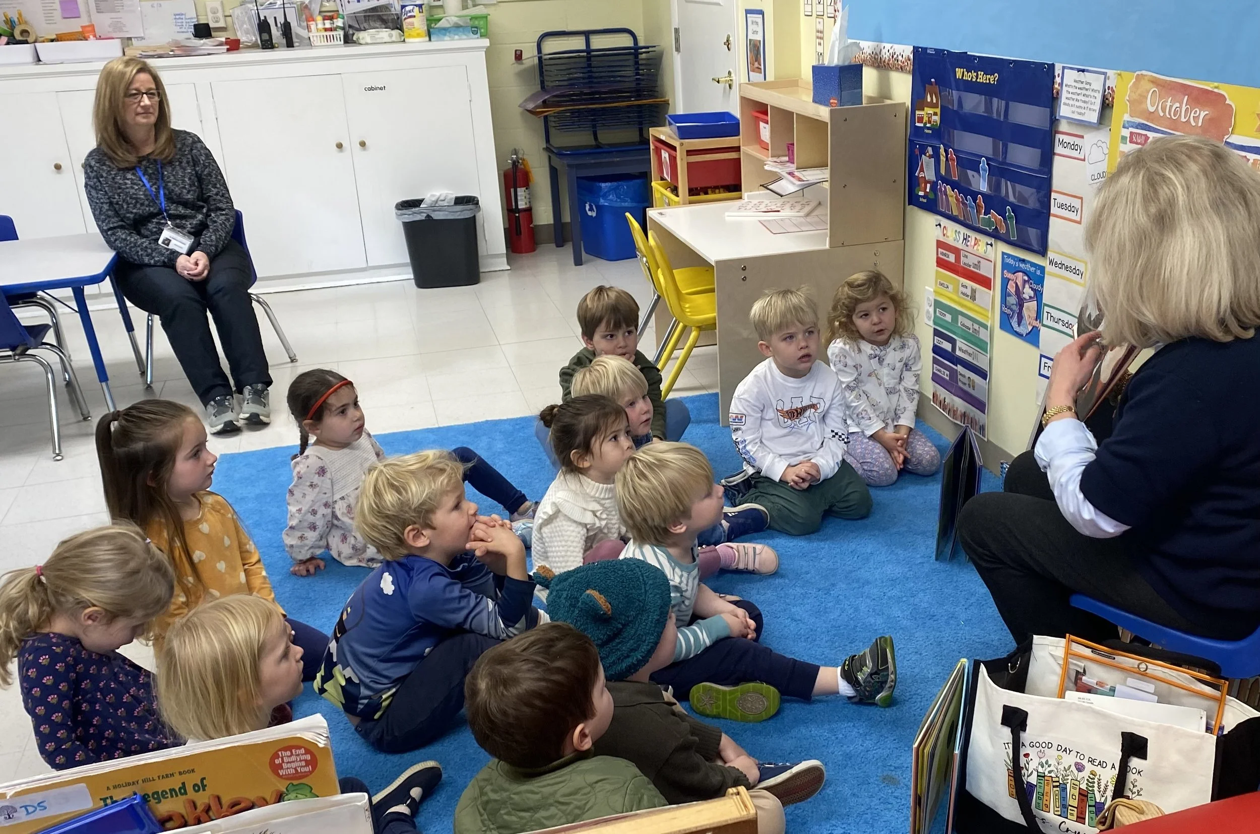 The Prekindergarten class seamlessly builds on the foundation that was created in the 2’s and 3’s. Four year olds utilize their skills and developing understanding into more complex play. Group learning and following directions allows Pre K children to master both skills and independence. Learning a letter and a sound a week through the multi sensory “Learning Without Tears” program helps our Pre K’ers to explore and gain confidence (and often mastery) with literacy skills in a fun and non threatening manner. Early reading and early math skills are incorporated into every part of the Pre K morning. In literacy the children work on rhyming, alliteration, recognizing sound patterns, and story prediction. In math the focus is on one to one correspondence, number recognition, shapes, patterning, and symmetry. All of these amazing and necessary skills are incorporated in a fun and developmentally appropriate practice.