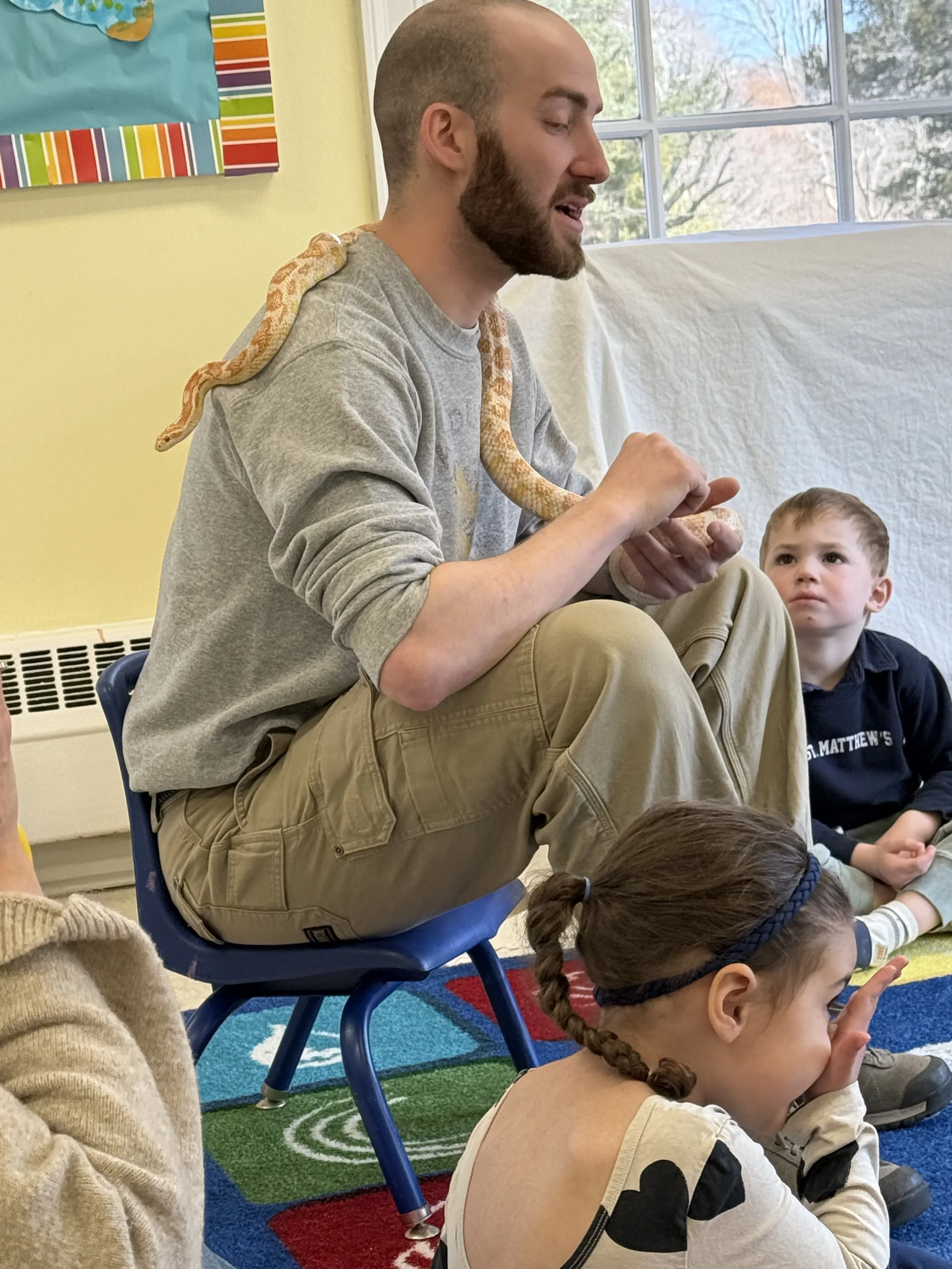 Once a month a Naturalist visits each class for 30-40 minutes. When the weather is nice, they take the children outside to look for signs of critters and changing seasons. Learning to be quiet observers, they spy bird’s nests both inhabited and abandoned, turn over rocks to see insects, listen to bird calls, and always keep their eyes out for signs and tracks. On inclement days, they settle into each classroom with critters, animal skins and stories to tell.